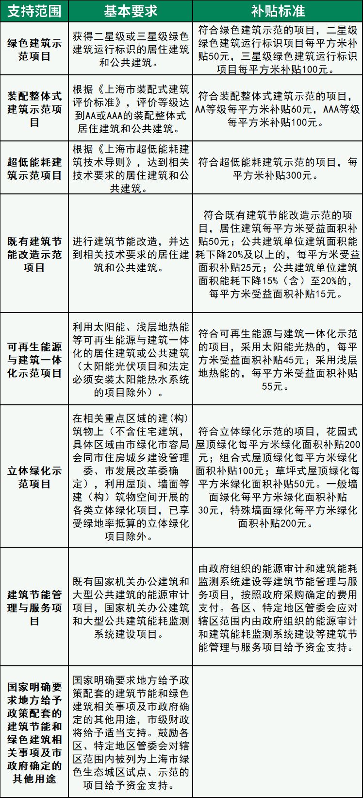 2、本次修訂將超低能耗建筑示范項(xiàng)目作為新增補(bǔ)貼項(xiàng)目類型,建筑面積要求為0.2萬平方米以上,補(bǔ)貼標(biāo)準(zhǔn)定為每平方米300元。