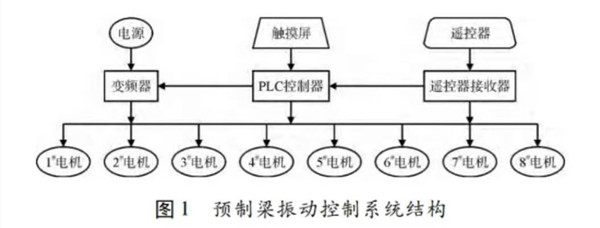 對控制柜的研究主要是研究振動控制系統,該振動控制系統擬采用15kW變頻器,與PLC控制器采用 Modbus通訊協議連接,接收來自PLC的控制指令。一臺變頻器拖動8臺1.5kW的振動電機,通過接收PLC控制指令改變自身輸出頻率來改變振動電機的運行狀態,同時PLC控制器輸出指令控制振動電機的運行與停止。采用觸摸屏與PLC控制器通訊,可用于修改以及顯示振動機低頻、中頻、高頻的運行時間。該控制系統既可以操作臺操作,也可以遙控器操作。預制混凝土梁自動振搗控制系統結構如圖1所示。